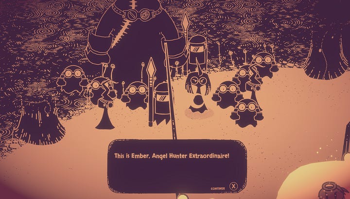 Most impressively is the diversity of the character designs seen in the ghosts and angels. Some of the most incredible art work is done with two colors and ink and the team of Moonloop Games really knocked it out of the park, characters were filled with expressive eyes to define their lack of facial features and free flowing body shapes explored a range of presence during interactions. I especially enjoyed the witty dialogue from sinister entities and morally gray Angel Hunters.